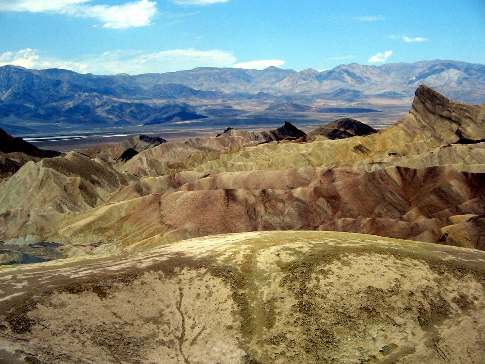 Death Valley as seen from Zabriskie Point. The area is composed of sediments from Furnace Creek Lake, which dried up 5 million years ago.