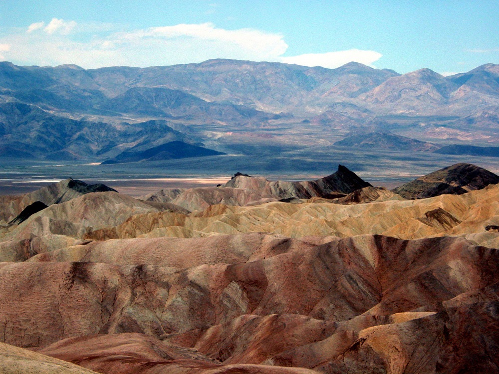 Death Valley as seen from Zabriskie Point. Great photography is relatively easy here due to its proximity to the main road and an established lookout point. The striking landscape is the product of erosion.